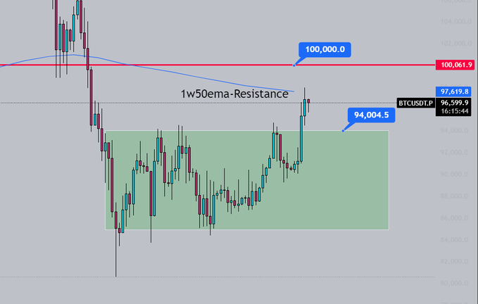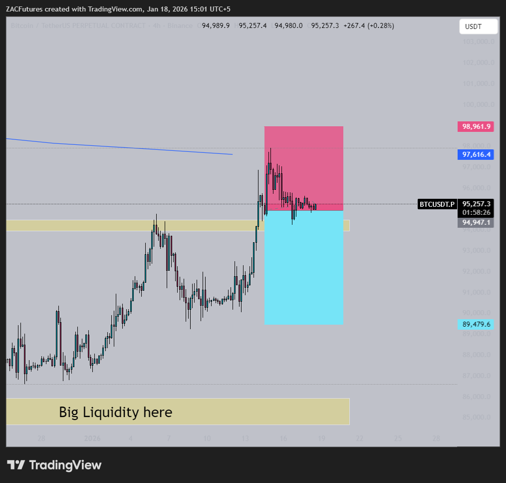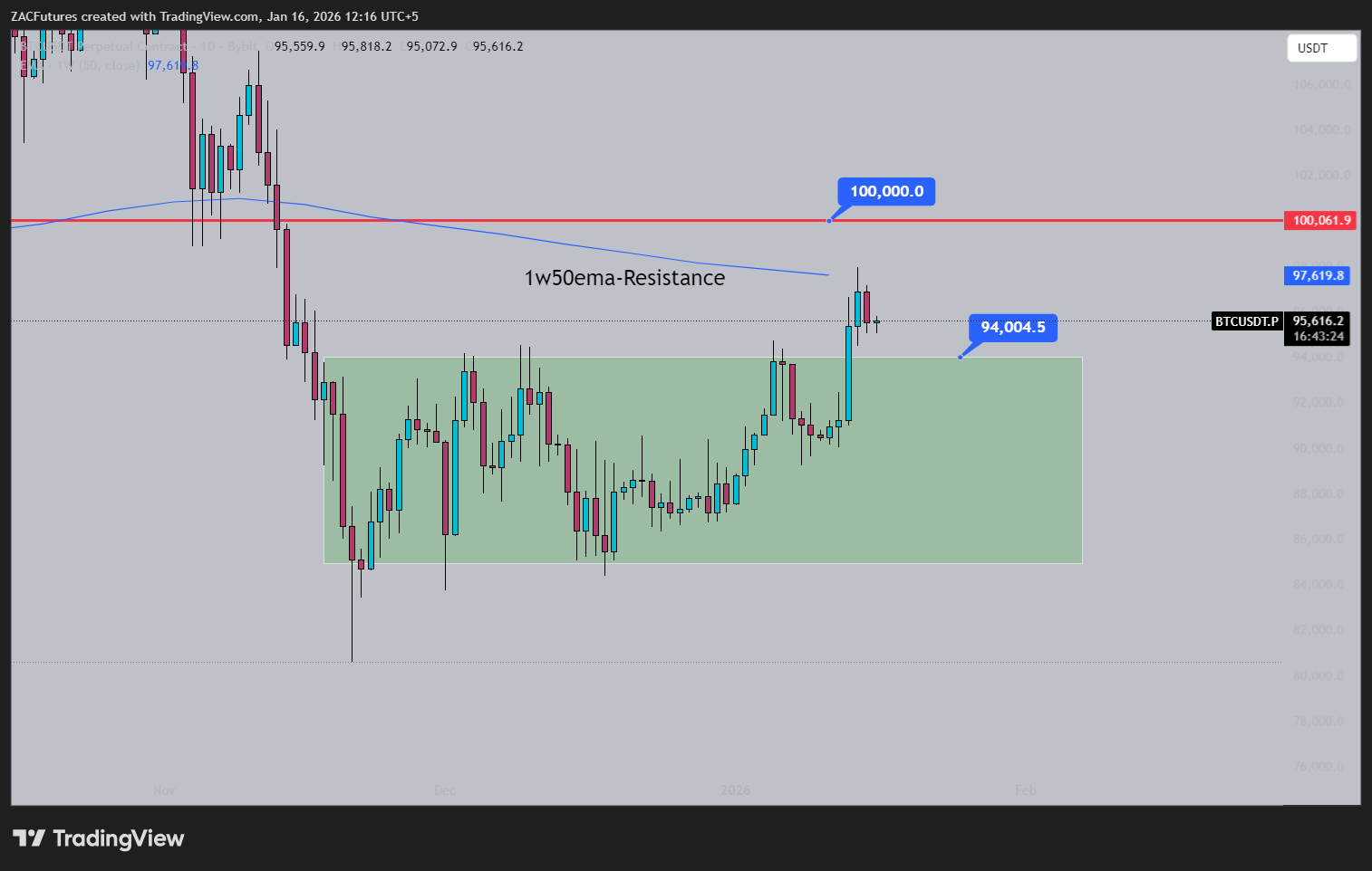 January 2026Short liquidation around 96k has been hit. The wick on the daily was intentional. Above that, we have far fewer liquidations compared to the downside. If you open longs now, be aware youre entering just below resistance. Yes, price can break upside with momentum but its very high risk. Breaking the 1W50EMA is a good sign. Above 100k is a very good sign and this level would act as strong "psychological" support. (as mentioned in the yesterday's btc update) So if longs are risky what about shorts? Shorts right now are fueling the uptrend you know what I mean? manipulation. In short and simple: Id open shorts when price returns to the 94k region. Conclusion: Price back above 100k: good for longs. Price below 94k: good for shorts.
